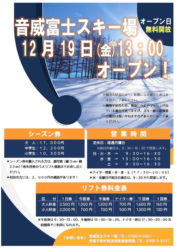 トップ > 各課 > 経済課産業振興室 > お知らせ > 【12月19日】音威富士スキー場 オープンのお知らせ
