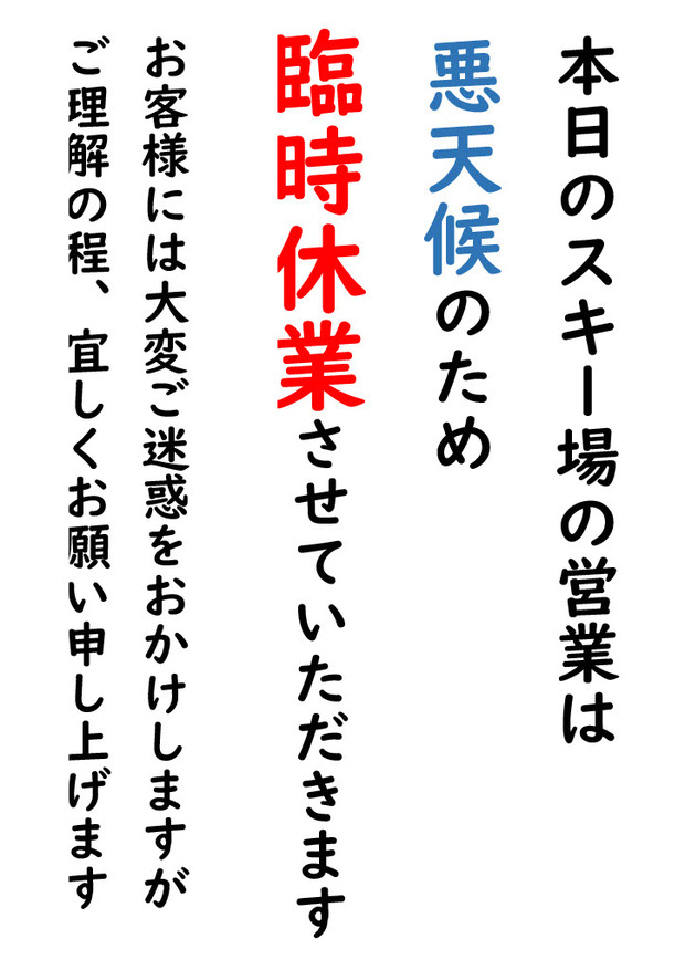 本日(2月6日)の営業につきまして、強風によりリフトを運行するには危険と判断したため、臨時休業といたします。