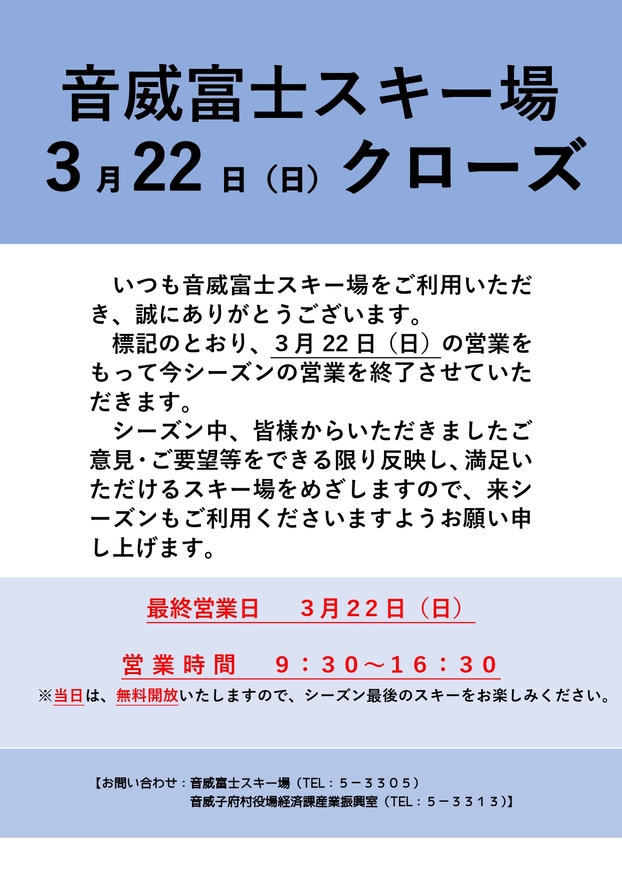 トップ > 各課 > 経済課産業振興室 > お知らせ > 音威富士スキー場 今年度の最終営業日について