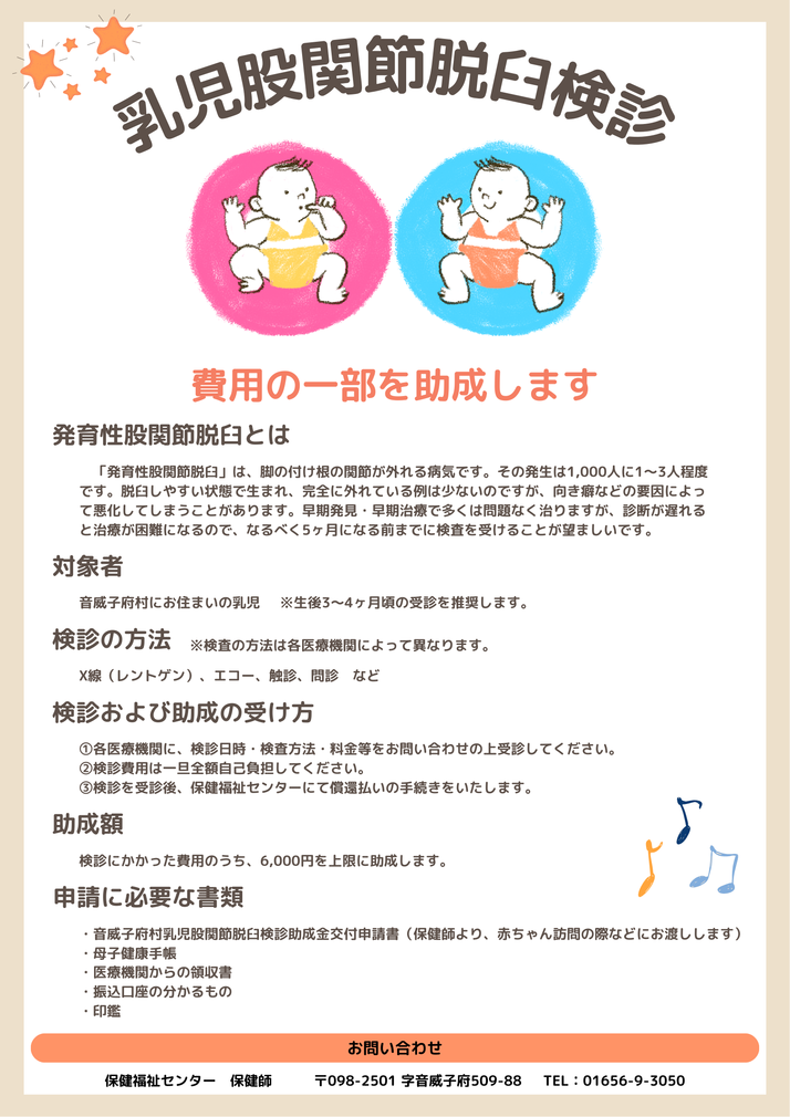 トップ > 各課 > 住民課保健福祉室 > 乳児股関節脱臼検診費の一部助成