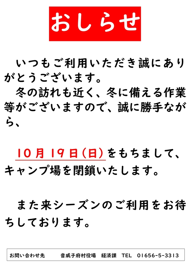 トップ > 各課 > 経済課産業振興室 > お知らせ > 中島公園キャンプ場・リバーサイドパークキャンプ場今季閉鎖のお知らせ